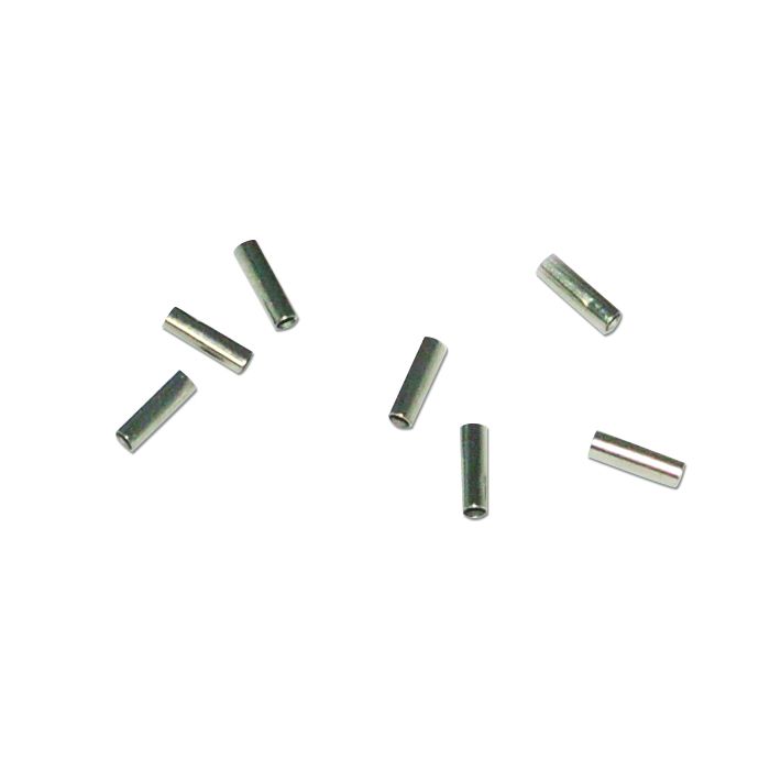 Nickel-plated copper crimps for attaching nylon-coated wire to posts and split pins.